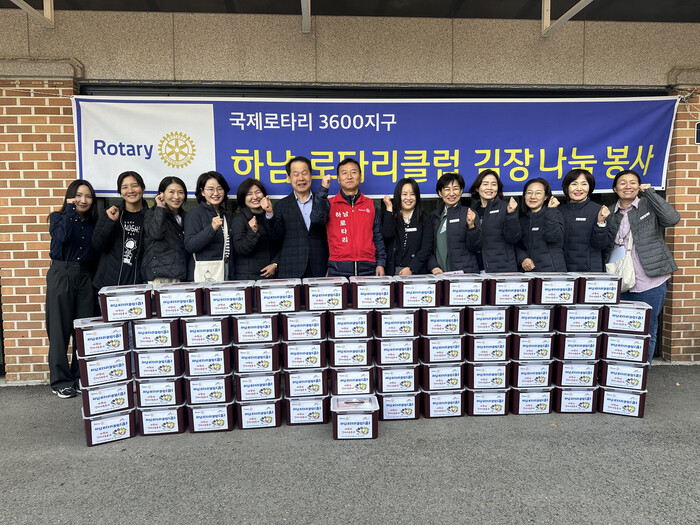 경기 하남시가 하남로타리클럽으로부터 저소득 취약계층 홀몸노인에게 전달할 김장김치 60박스를 기탁 받았다. 사진은 기탁식 관계자들이 기념 촬영하는 모습. (사진=하남시청 제공)