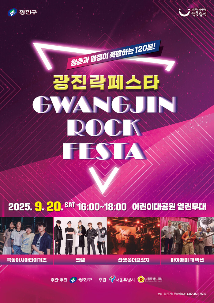 ‘광진 락 페스타’는 누구나 무료로 관람할 수 있으며, 자세한 사항은 광진구청 문화예술과로 문의하면 된다.