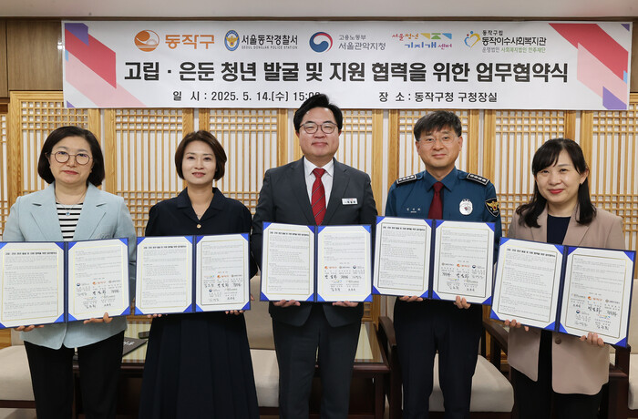 이날 협약식에는 박일하 구청장을 비롯해 김주희 서울청년기지개센터장, 조은숙 동작이수사회복지관장, 김영심 고용노동부 서울관악고용노동지청장, 정석화 동작경찰서장이 참석했다.
