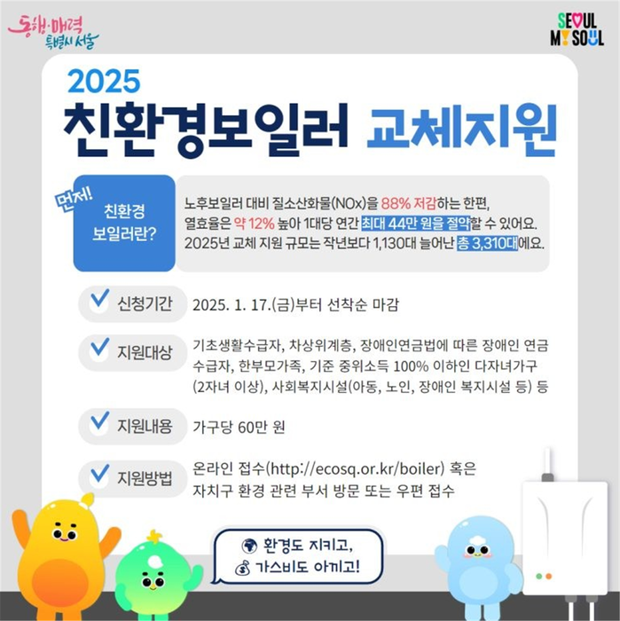 구는 서울시(녹색에너지과)로부터 친환경 보일러 75대에 대한 예산지원을 받아 10년 이상 된 노후보일러를 교체한 구민에게 최대 60만원의 지원금을 선착순으로 지급한다.
