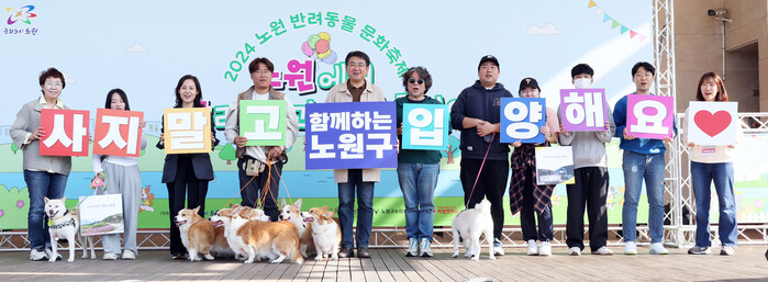 오승록 서울 노원구청장이 최근 노원마들스타디움 축구장에서 열린 2024 반려동물 문화축제 ‘노원반함’에 참석했다. 사진은 오 구청장(왼쪽 다섯 번째)이 축제 참석자들과 기념 촬영하는 모습. (사진=노원구청 제공)