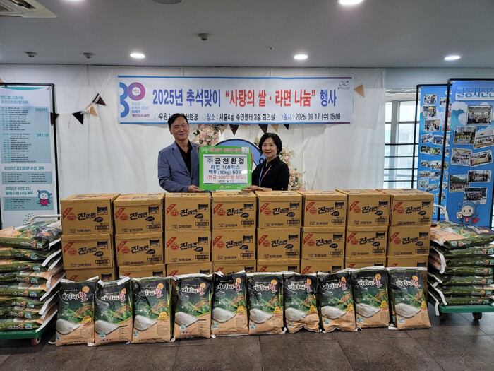 (주)금천환경에서 최근 서울 금천구 시흥1동 주민센터와 시흥4동 주민센터에 취약계층을 위한 추석맞이 물품을 기탁했다. 사진은 기탁식에서 김지연 시흥4동장(오른쪽)이 김재식 (주)금천환경 대표와 기념촬영을 하고 있는 모습. (사진=금천구청 제공)
