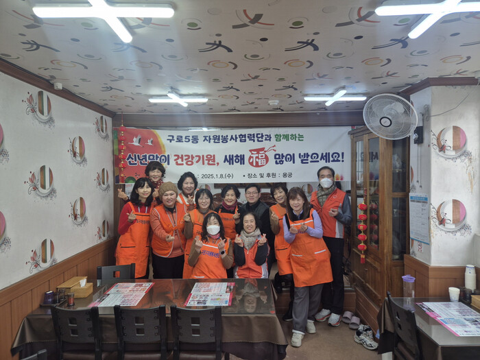 | ▲ 8일 구로5동 주민센터에서 개최된 신년맞이 건강기원 행사에서 자원봉사협력단이 기념 촬영을 하고 있다. (사진=구로구청 제공) |