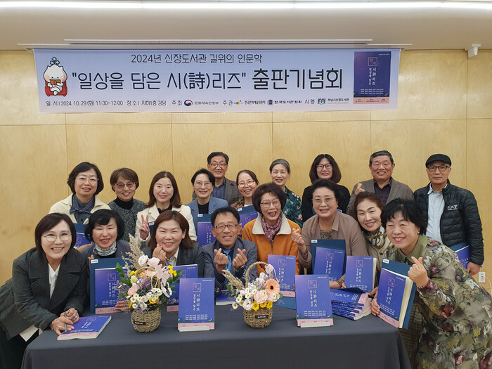 경기 하남시가 최근 신장도서관에서 문학을 사랑하는 지역주민들이 직접 찍은 사진과 시를 책으로 담아낸 ‘일상을 담은 시(詩)리즈’ 시집 출판기념회를 개최했다. 사진은 기념회에 참석한 시민들이 기념 촬영하는 모습. (사진=하남시청 제공)