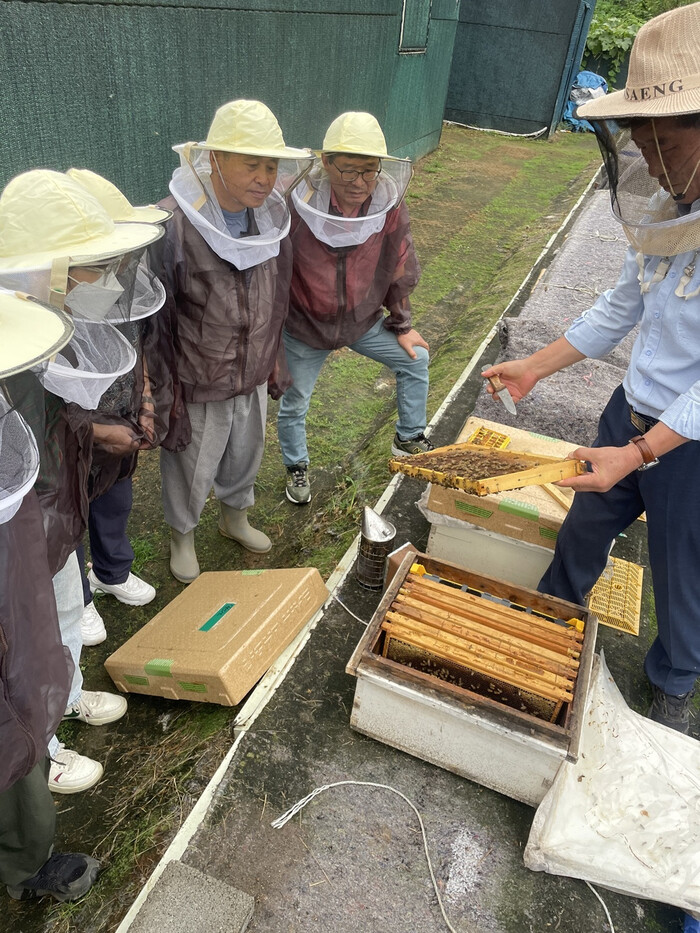 | ▲ 양봉교육 수강생들이 보호 장비를 착용하고 벌통을 관찰하며 양봉을 체험하고 있다. (사진=구로구청 제공) |