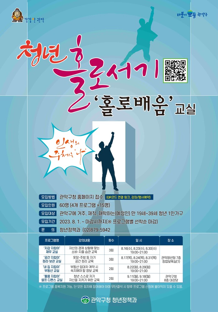 [시민일보 = 여영준 기자] 서울 관악구(구청장 박준희)는 오는 16일~9월18일 청년 1인 가구를 위한 '청년 홀로서기, 홀로배움 교실'을 운영한다고 밝혔다.