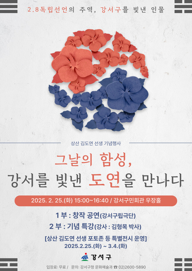 행사는 1부와 2부로 나눠 진행된다. 1부는 강서구립극단 ‘비상’이 준비한 창작 뮤지컬 ‘도연’ 특별 공연이 펼쳐진다. 또한 주요 내빈들의 2.8 독립선언서 결의문 낭독이 이뤄질 예정이다.