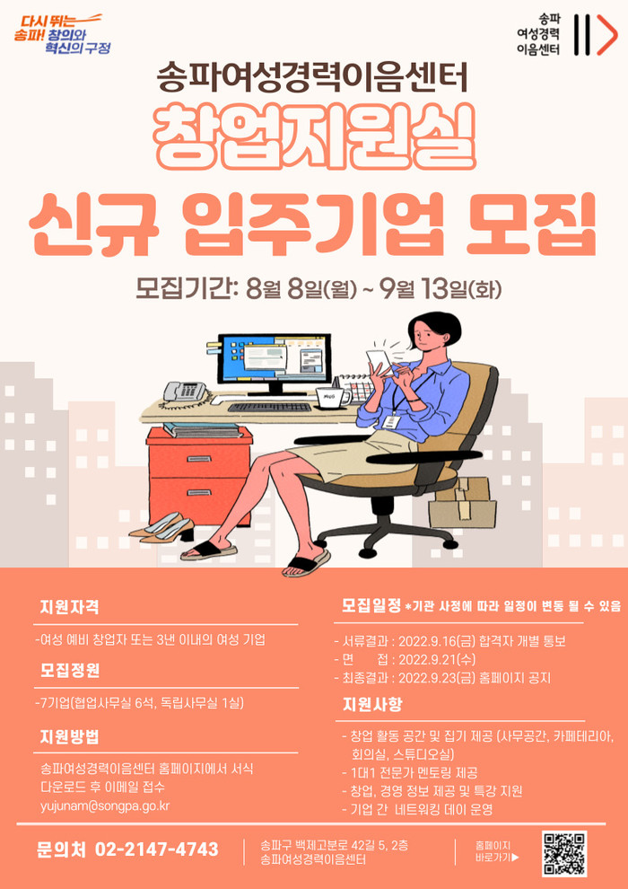 | ▲ 송파여성경력이음센터 창업지원실 신규 입주기업 모집 공고(사진제공=송파구청) |