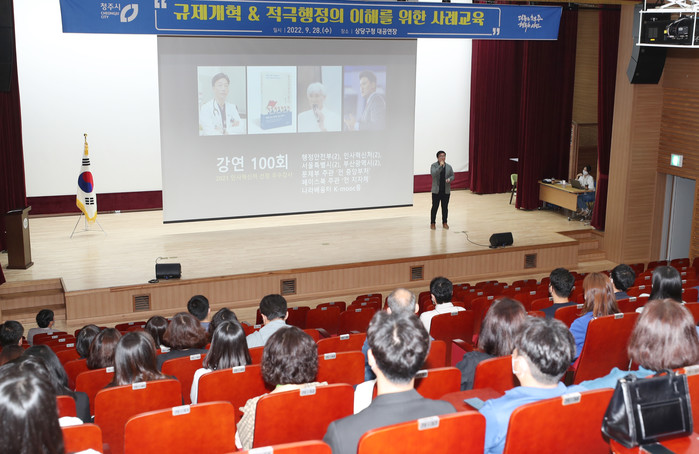 이번 교육은 규제개혁 및 적극행정에 대한 개념을 이해하고 강사가 현장에서 직접 경험했던 시정 홍보에 대한 적극 행정사례, 곤충사육업 신고 시 모든 허가를 한 번에 받을 수 있도록 인·허가제도를 개선토록 한 규제개혁사례 등 사례 위주로 진행해 직원들의 공감대를 형성했다.