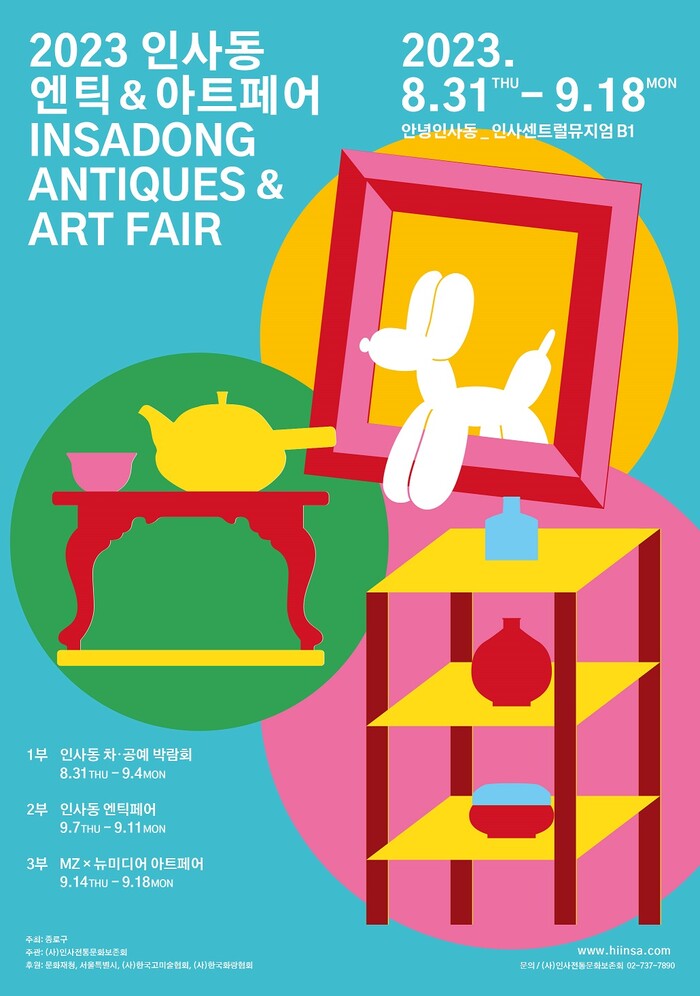종로구가 주최하고 (사)인사전통문화보존회가 주관하는 이번 축제는 31일 ▲개막식 ▲1부 차·공예 박람회를 시작으로 ▲2부 인사동 엔틱페어 ▲3부 MZ×뉴미디어 아트페어 순으로 오는 9월18일까지 이어진다.