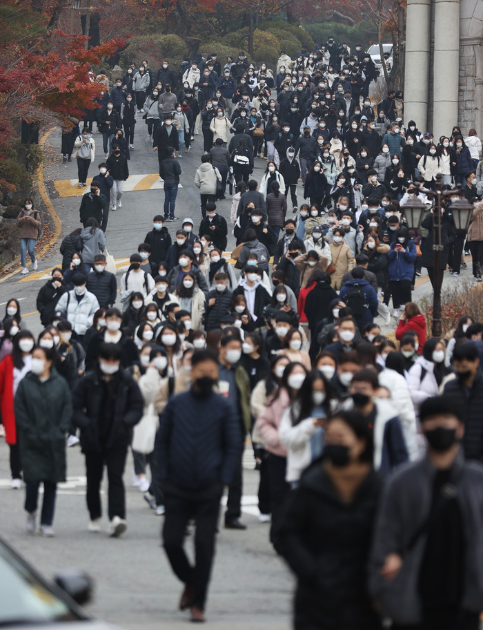 21일 서울 동대문구 경희대학교에서 2022학년도 수시모집 논술고사를 마친 수험생들이 고사장을 나서고 있다.
