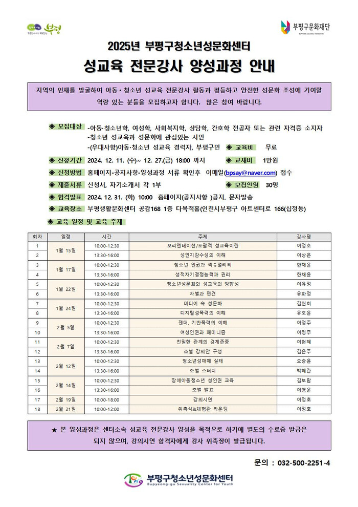 [인천=문찬식 기자] 인천 부평구 청소년성문화센터는 오는 11일부터 27일까지 ‘2025년 성교육전문강사 양성과정’ 참여자를 모집한다.