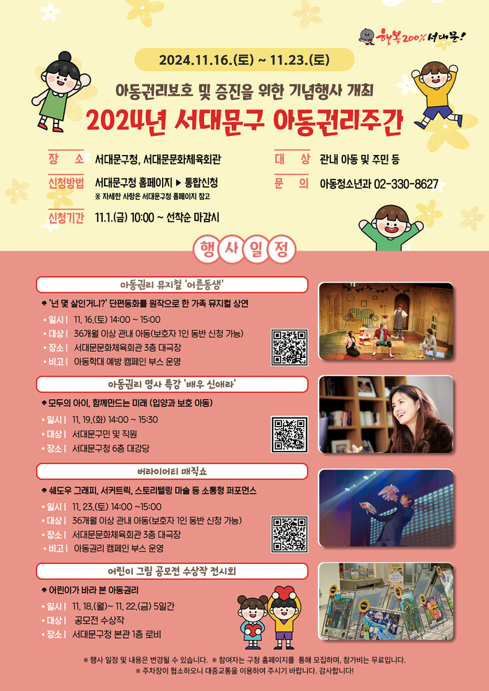 먼저 16일 오후 2∼3시 서대문문화체육회관 3층 대극장에서는 아동권리 뮤지컬 ‘어른동생’이 공연된다. 이에 맞춰 행사장 입구에서는 ‘말 상처 카드’를 이용한 아동학대 예방 캠페인과 ‘서대문구 아동참여위원회’의 ‘디지털 환경 속 아동권리 캠페인’이 함께 펼쳐진다.