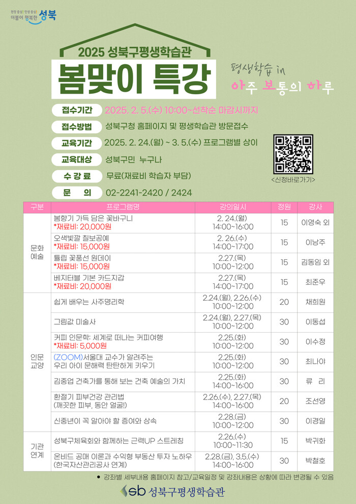 [시민일보 = 문민호 기자] 서울 성북구(구청장 이승로)가 오는 24일~3월5일 성북구평생학습관에서 진행되는 ‘2025 봄맞이 특강’을 통해 지역주민들에게 다양한 배움의 기회를 제공한다