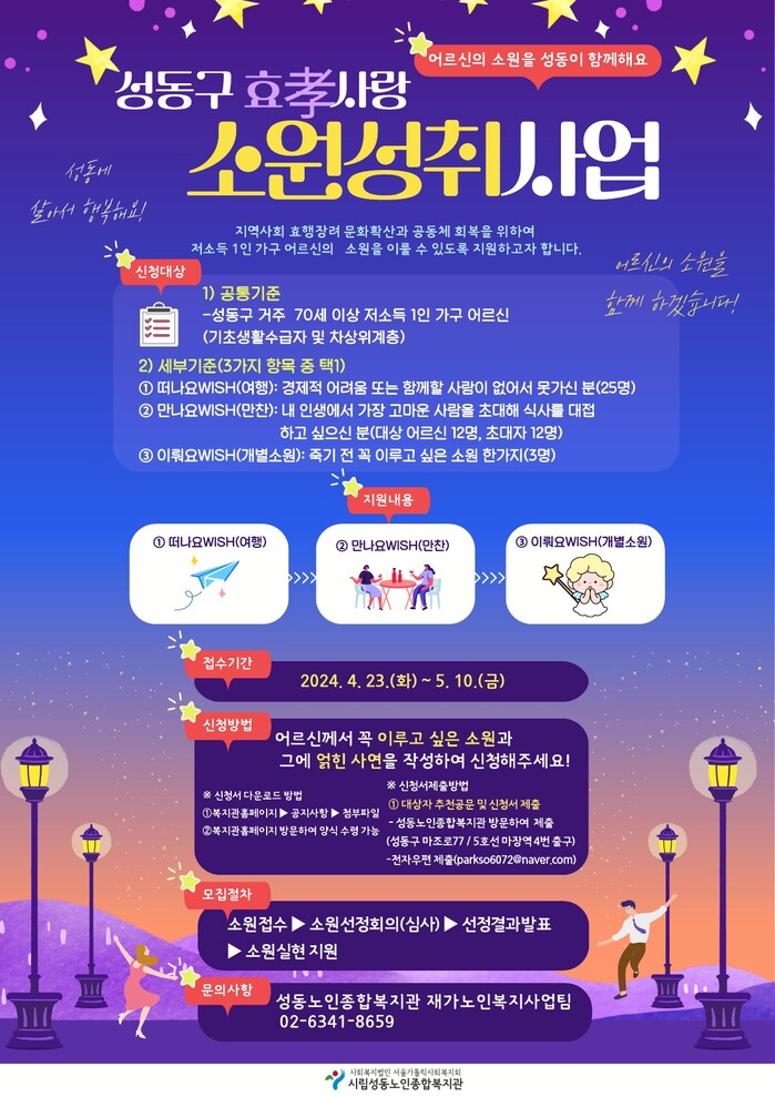 신청 기간은 5월 10일까지로 해당 분야에 따른 구체적인 소원과 그에 얽힌 사연을 작성해 성동노인종합복지관에 제출하면 소원선정 심사위원회의 심사를 거쳐 대상자가 선정된다. 신청서는 성동노인종합복지관 누리집에서 내려받을 수 있다.