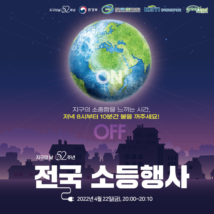 ‘지구의 날’은 1969년 미국 캠리포니아주에서 발생한 해상원유 유출사고를 계기로 1970년 4월 22일 지구의 환경을 보호하자는 취지로 시작된 세계기념일로 이날 소등행사에 전국이 참여한다.