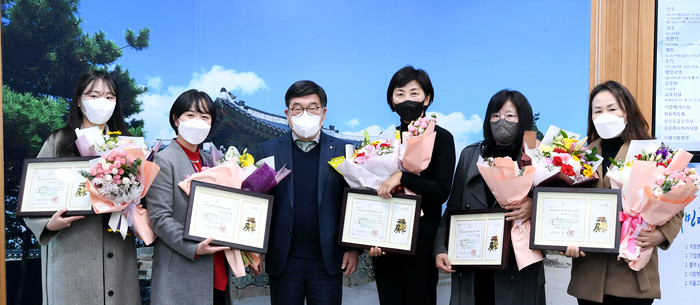 경기 광주시는 최근 지역내 청소년들의 다양한 교육기회 제공과 창의적 역량 강화에 기여한 유공자를 격려하기 위해 표창장 수여식을 진행했다. 광주하남교육지원청 허은경 장학사, 광주혁신교육지구 강윤진·송영숙 마을강사, 문용진·박순화 탐방강사가 유공자로 선정됐다. 사진은 이날 수여식에서 신동헌 시장(왼쪽 세 번째)과 수상자들이 기념촬영을 하는 모습. (사진제공=광주시청)