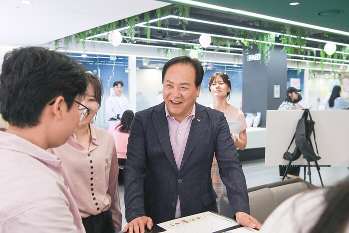 경기 오산시가 최근 오산청년일자리지원센터 이루잡에서 열린 제5회 청년의 날 기념행사 ‘아주 보통의 하루’를 성공적으로 마무리했다. 사진은 행사에서 이권재 시장이 다양한 프로그램을 둘러보며 청년들과 소통하는 모습. (사진=오산시청 제공)
