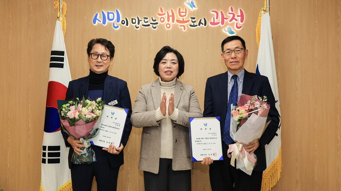 경기 과천시가 최근 원문동과 문원동에 각 1명씩 총 2명의 시민을 명예동장으로 위촉했다. 사진은 신계용 시장(가운데)이 명예동장으로 위촉된 최정락 원문동 체육회장(왼쪽)과 이병섭 문원동 주민자치위원장과 기념 촬영을 하고 있다. (사진=과천시청 제공)