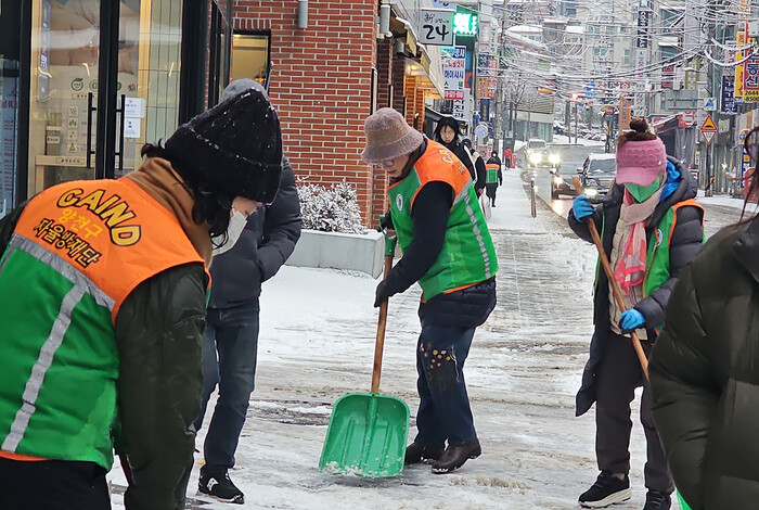 | ▲ 양천구 지역자율방재단이 지난 5일 이면도로 제설작업을 하고 있다. (사진=양천구청 제공) |