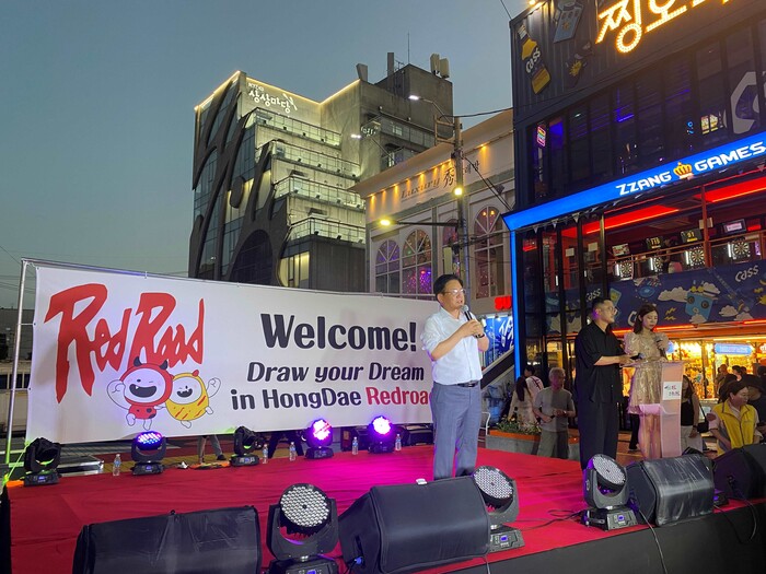 | ▲ 8일 저녁 홍대 레드로드에서 열린 '영국 스카우트 단원 특별 버스킹 공연'에서 박강수 구청장이 인사말을 전하고 있다. (사진=마포구청 제공) |