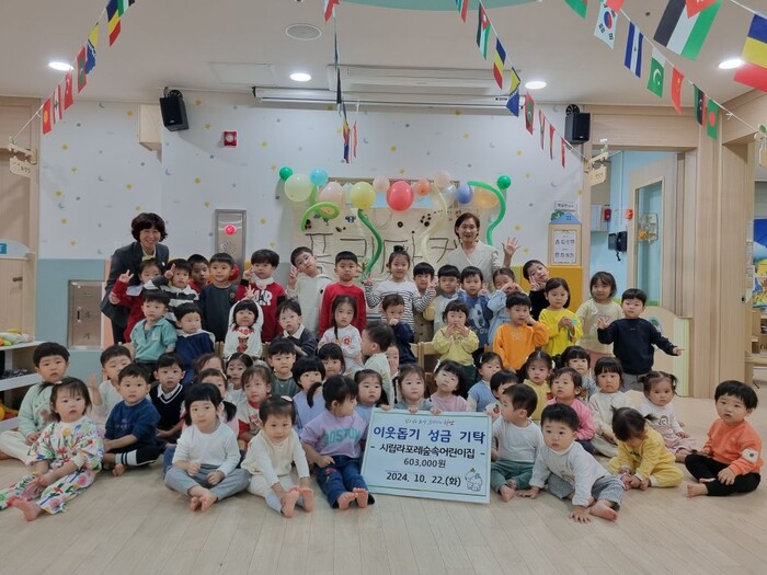 경기 하남시 시립라포레숲속어린이집이 최근 '어린이집 플리마켓' 활동을 통한 수익금 전액을 감일동행정복지센터에 전달했다. 사진은 어린이집 아이들과 관계자들이 기념 촬영하는 모습. (사진=하남시청 제공)