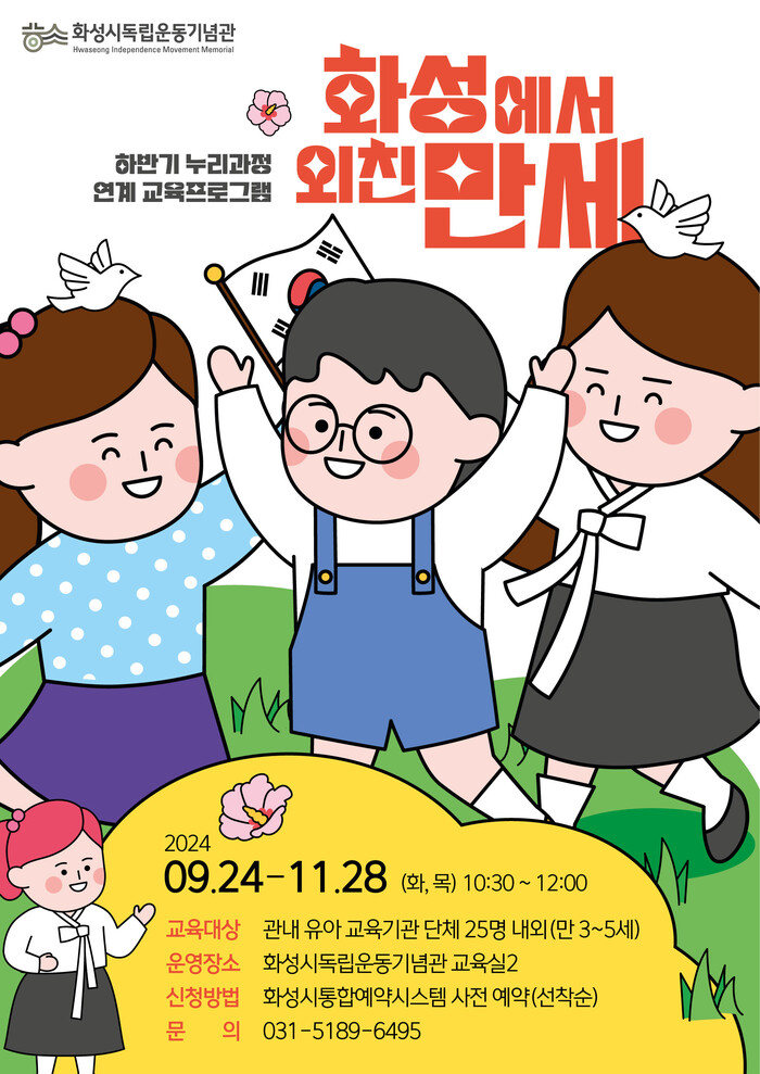 [화성=김정수 기자] 경기 화성시독립운동기념관이 2024년 하반기 누리과정과 연계한 특성화 교육프로그램 ‘화성에서 외친 만세’를 오는 24일부터 11월28일까지 운영한다.