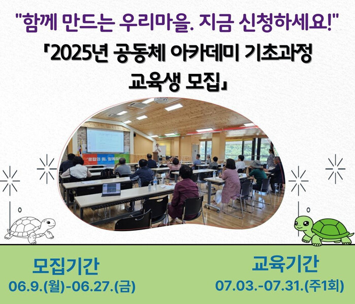 [홍성=최복규 기자] 충남 홍성군 마을만들기지원센터는 2025년 공동체 아카데미 기초과정 교육에 함께할 참여자를 모집한다.
