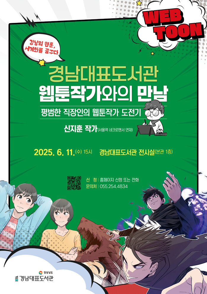 신민철 경남대표도서관장은 “이번 강연은 웹툰에 관심 있는 도민은 물론, 창작을 꿈꾸는 모든 이들에게 영감을 주는 시간이 될 것”이라며 “도전과 성취의 이야기를 통해 도민들이 문화 콘텐츠에 더욱 친근하게 다가갈 수 있기를 기대한다”라고 전했다.