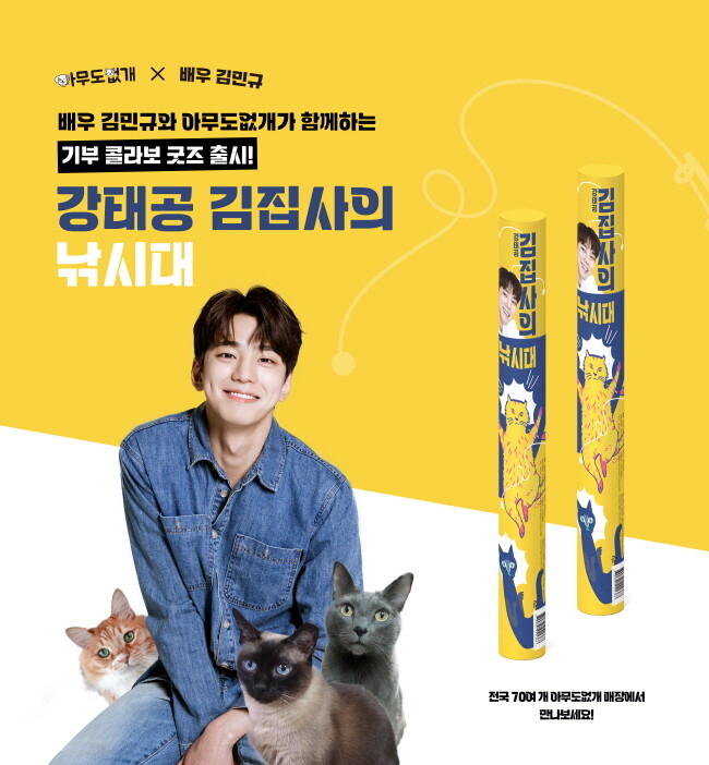 이에 ‘아무도없개’는 이번 콜라보레이션을 통해 고양이낚싯대 장난감을 콜라보 아이템으로 선정하였으며 배우 김민규 사진과 본인이 직접 그린 반려묘 그림을 담았다.