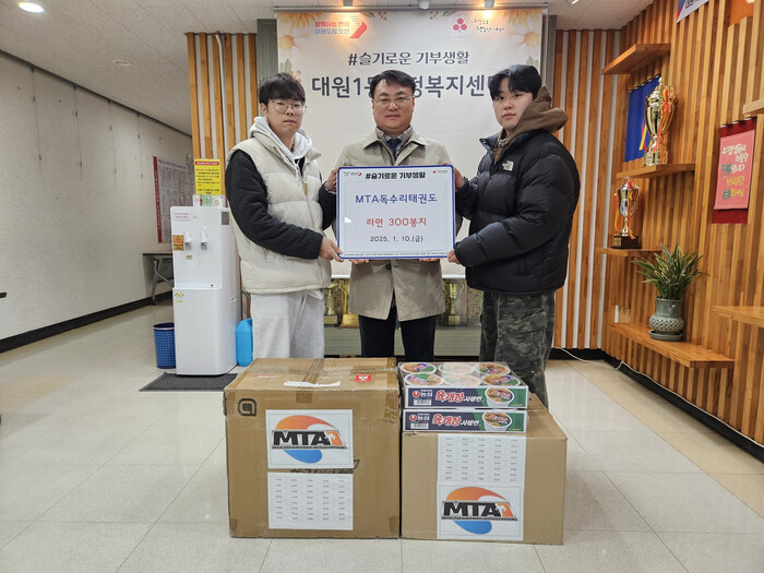 경기 오산시 대원1동이 최근 갈곶동에 위치한 MTA독수리태권도학원으로부터 새해맞이 어려운 이웃을 위한 라면 300봉지를 기탁받았다. 사진은 기탁식에서 관계자들이 기념 촬영을 하는 모습. (사진=오산시청 제공)
