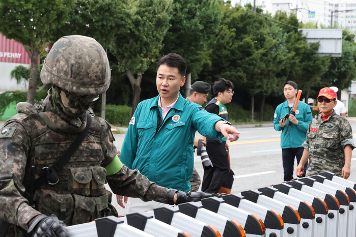 서울 도봉구는 22일 도봉구 전 지역에서 을지연습과 연계한 ‘공습 대비’ 민방위 훈련을 실시했다. 이번 훈련은 공습경보 발령에 따른 주민대피 등 실제 비상상황에 대비한 훈련으로 진행됐다. 사진은 오언석 구청장(왼쪽 두번째)이 군·경 교통통제소 설치 훈련을 참관하고 있는 모습.(사진=도봉구청 제공)