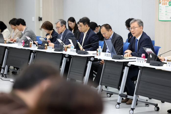 서울 구로구가 최근 구청 창의홀에서 새로운 민선8기 첫 확대간부회의를 개최했다. 이번 회의는 본청, 보건소, 동 주민센터 등 5급 이상 간부가 참여한 가운데 부서·동별 주요업무를 보고하는 방식으로 진행됐다. 사진은 장인홍 구청장(맨 오른쪽)이 확대간부회의에서 발언하는 모습. (사진=구로구청 제공)