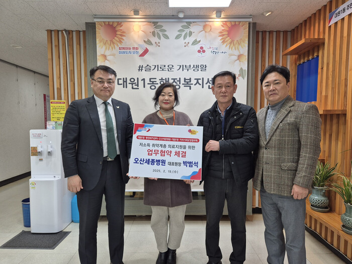 경기 오산시 대원1동은 19일 복지자원 발굴연계 및 저소득 취약계층 지원을 위한 업무협약을 체결했다. 이날 협약식은 대원1동 행정복지센터, 대원1동 지역사회보장협의체, 오산세종병원 등 3개 기관이 협약에 참석했다. 사진은 협약식에서 관계자들이 기념 촬영을 하는 모습. (사진=오산시청 제공)