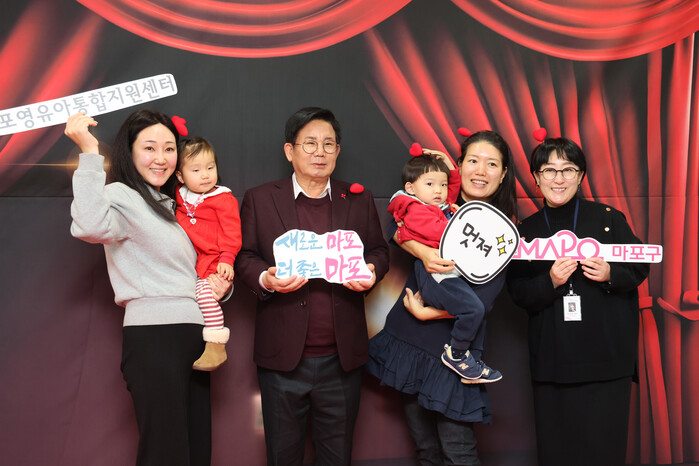 박강수 서울 마포구청장은 최근 ‘마포영유아통합지원센터’의 연말행사 '시소와 그네와 함께한 봄·여름·가을·겨울'에 참석해 영유아 가족, 유관기관 관계자들과 특별한 시간을 보냈다. 사진은 박강수 구청장이 행사에 참석한 가족들과 기념촬영을 하고 있는 모습. (사진=마포구청 제공)