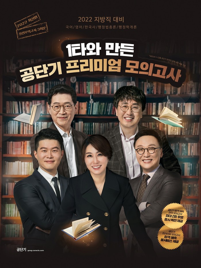 '2022 공단기 프리미엄 모의고사'는 ▲국어 ▲영어 ▲한국사 ▲행정법총론 ▲행정학개론 필수 5과목을 묶은 3회차 모의고사, 정답과 해설, OMR 카드가 포함된 통합형 봉투 모의고사다.