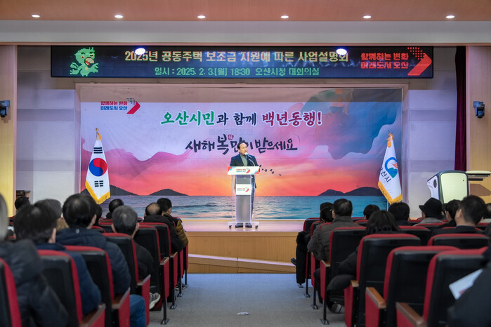 경기 오산시가 최근 공동주택 보조금 지원사업의 실질적이고 효과적인 수행을 위해 지역내 공동주택 단지별 관리사무소장과 입주자대표회의 등 관계자 등 100여명의 시민을 대상으로 공동주택 보조금 지원 사업설명회를 개최했다. 사진은 설명회에서 이권재 시장이 인사말을 하는 모습. (사진=오산시청 제공)