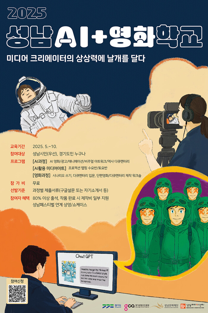 ‘성남AI+영화학교’ 프로그램 중 AI 콘텐츠 과정은 5월 24일 오리엔테이션과 AI 관련 특강으로 시작하고, 미디어아트와 영화 과정은 성남미디어센터 홈페이지를 통해 신청할 수 있다. 크리에이터 제작지원은 별도 공고를 통해 접수할 수 있으며, 서류 및 면접 심사를 통해 최종 선발할 예정이다.