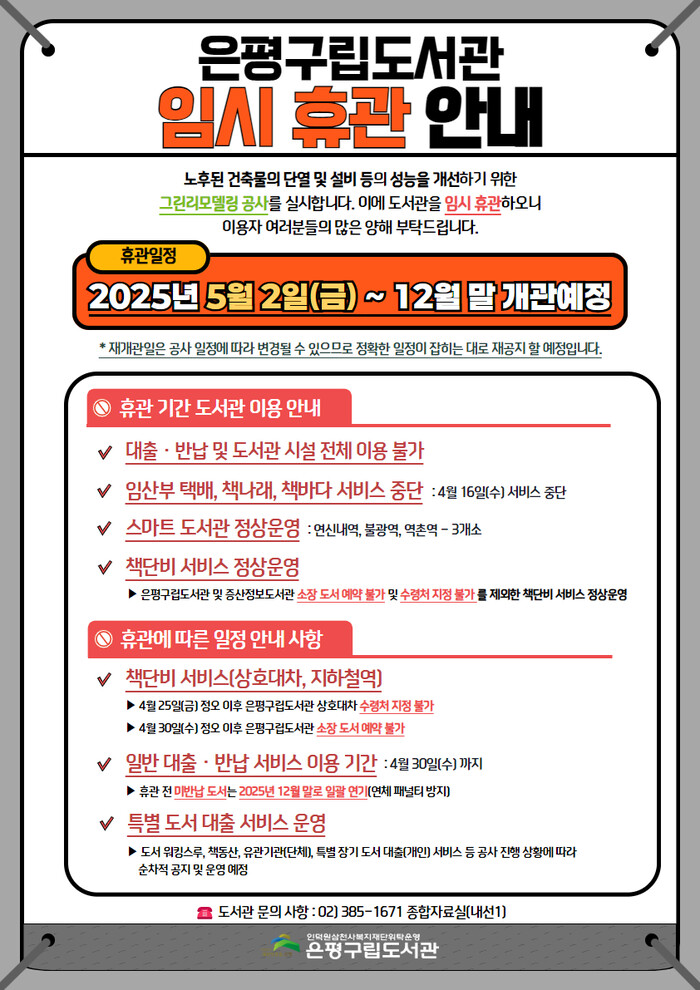 은평구립도서관은 5월 2일부터 12월 말까지 휴관하며, 구립증산정보도서관은 5월 12일부터 12월 말까지 휴관에 들어간다. 휴관 기간 동안 두 도서관은 이용자들의 불편을 최소화하기 위해 다양한 대체 서비스를 운영할 예정이다.