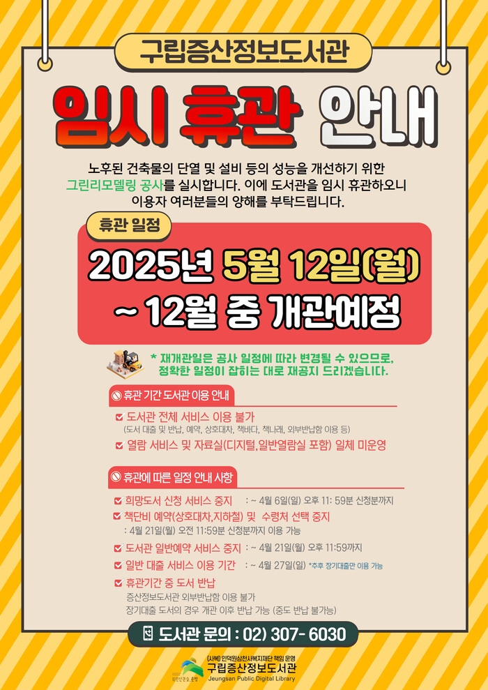 도서관 관계자는 "그린리모델링 공사를 통해 도서관의 에너지 효율성을 높이고, 이용자들에게 더 나은 환경을 제공할 수 있도록 노력할 것"이라고 밝혔다. 휴관기간 동안의 도서관 서비스는 공사 진행 상황에 따라 순차적으로 재개되며 자세한 일정은 추후 각 도서관 홈페이지에서 확인하면 된다.