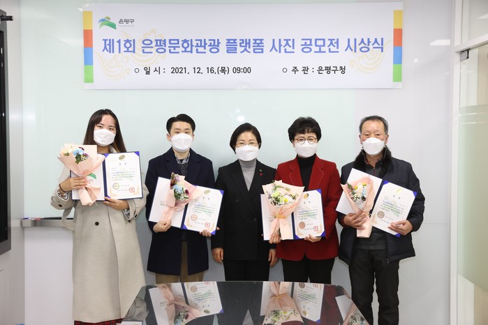 서울 은평구는 16일 ‘제1회 은평문화관광 사진공모전 시상식’을 개최했다. 이번 공모전은 은평구의 관광자원을 주제로 지난 9~10월에 진행됐으며 참여대상에 제한 없이 은평구 관광명소, 문화 등을 표현한 사진을 공모했다. 사진은 시상식에서 김미경 구청장(가운데)과 수상자들이 기념촬영을 하는 모습. (사진제공=은평구청)