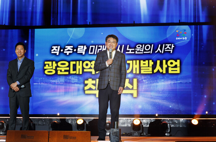 오승록 서울 노원구청장이 최근 광운대역세권 개발사업 부지 내에서 열린 ‘광운대역세권 개발사업’ 착공식에 참석했다. 사진은 오 구청장이 착공식에 참석해 인사말하는 모습. (사진=노원구청 제공)