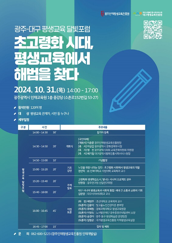 광주인재평생교육진흥원 이춘문 원장은 “초고령화 사회는 더 이상 먼 미래의 이야기가 아니라 우리가 직면하고 있는 현실이다”며, “광주와 대구가 협력해 마련한 이 자리를 통해 평생교육이 세대 간 및 양 지역의 소통과 사회적 통합을 촉진하는 중요한 역할을 할 수 있기를 기대한다”고 말했다.