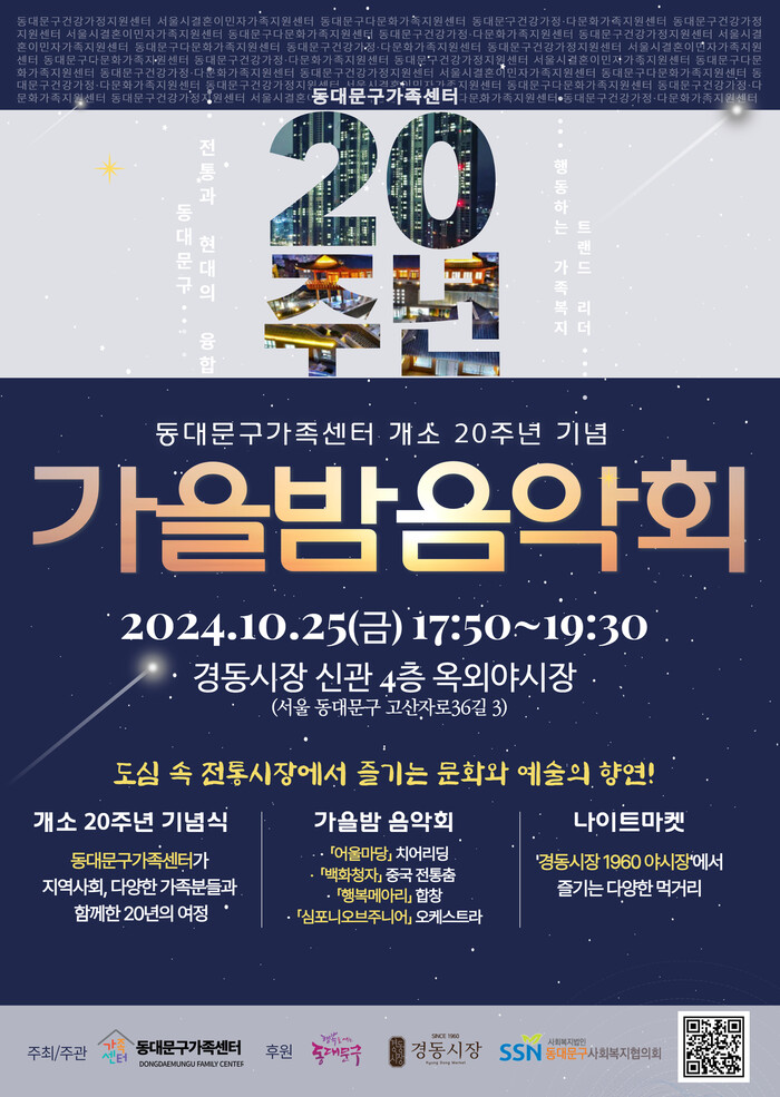[시민일보 = 이대우 기자] 서울 동대문구가족센터가 개소 20주년을 맞아 25일 경동시장 신관 4층 옥외야시장에서 ‘가을밤 음악회’를 개최한다.