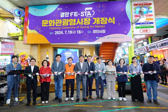 경기 광주시는 최근 경안시장 문화관광형시장 육성 사업 개장식 및 ‘경안FE-STA’를 개최했다. 사진은 이날 개장식에서 방세환 시장(오른쪽 일곱번째)과 관계자들이 테이프 커팅을 하고 있는 모습. (사진=광주시청 제공)