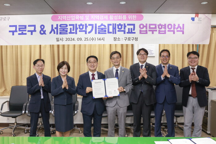 서울 구로구가 최근 구청 르네상스홀에서 서울과학기술대학교(이하 서울과기대)와 업무협약을 체결하고 이를 통해 지역산업육성과 기술경쟁력을 강화해 지역경제를 활성화시킬 예정이다. 사진은 문헌일 구청장(왼쪽 세 번째)과 서울과기대 관계자들이 기념 촬영하는 모습. (사진=구로구청 제공)