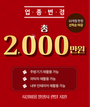 홍짜장은 현재 선착순 10개점에 한정하여 업종변경창업 혜택을 선보이고 있다. 홍짜장 예비 창업자들은 평수에 관계없이 기존에 사용하던 매장 내부 인테리어나 의자, 탁자, 주방기기 등을 모두 재활용할 수 있으며, 추가적으로 시설 비용이 발생할 경우 2천만원 상당의 렌탈 서비스도 지원받을 수 있다는 게 업체 측 설명이다.