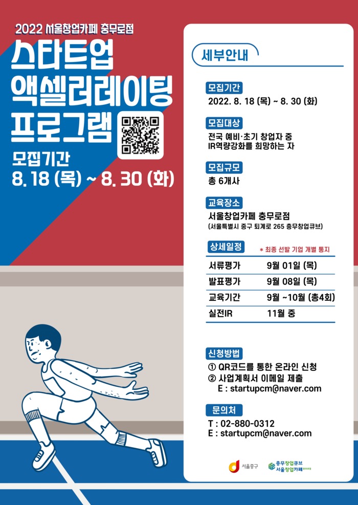 [시민일보 = 여영준 기자] 중구(구청장 김길성)는 오는 9~11월 청년창업센터 충무창업큐브에서 민간 액셀러레이터(창업기획자)와 협력해 스타트업 액셀러레이팅 프로그램을 운영한다고 밝혔다.