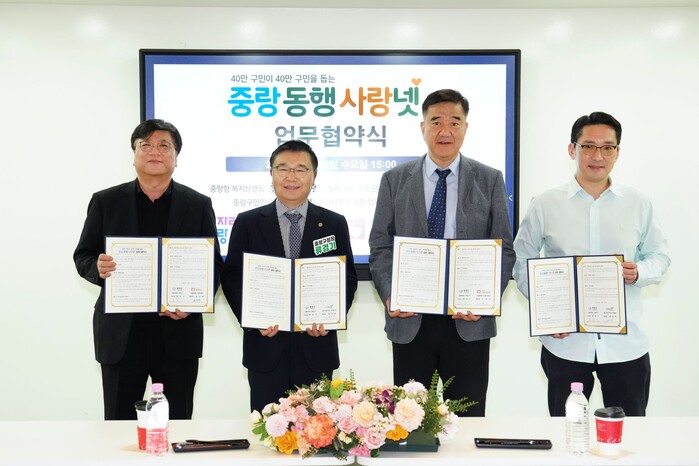 서울 중랑구가 최근 ‘중랑 동행 사랑넷’ 건강 분야 지원 확대를 위해 지역 내 민간 병원과 업무협약을 체결했다. ‘중랑 동행 사랑넷’은 40만 구민이 40만 구민을 돕는 지역사회 나눔 플랫폼으로, 기부, 관계망 형성, 재능 나눔, 건강, 교육의 5대 분야 사업을 통해 보다 쉽고 편리하게 구민을 연계해 따뜻한 공동체를 만들어 가는 중랑형 복지브랜드이다. 사진은 류경기 구청장(왼쪽 두 번째)이 참석자들과 기념촬영을 하고 있는 모습.(사진=중랑구청 제공)