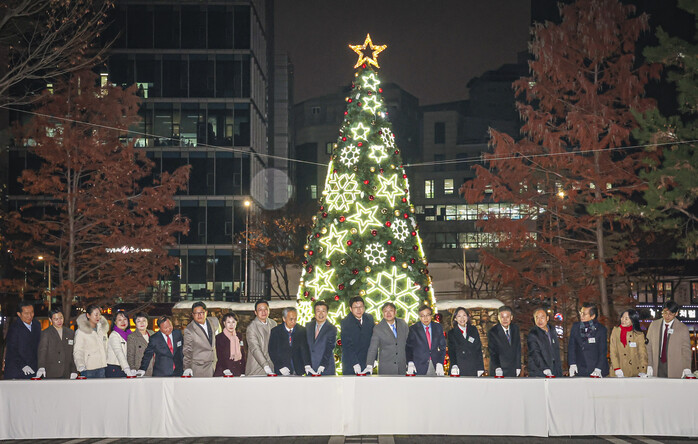 서울 서초구가 연말을 맞아 최근 구청 광장에서 ‘2024 성탄트리 점등식’을 개최했다. 이날 점등된 6m 높이의 대형트리는 내년 1월31일까지 매일 오후 6~10시에 구청 광장을 밝힐 예정이다. 사진은 전성수 구청장이 점등식에 참석해 기념 촬영하는 모습. (사진=서초구청 제공)